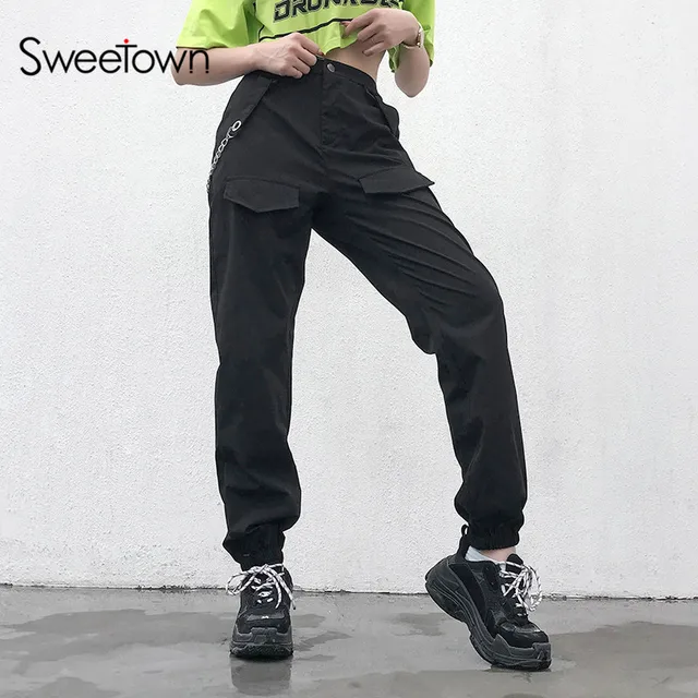 Free Shipping Sweetown Black Solid Punk Gothic Streetwear Pants With Metal Chain Straps Pockets Elastic High Wais are attractive to buyers from around the world