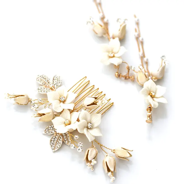 70% OFF 4000028293423 White Enamel Floral Bridal Hair Comb Rhinestone Hair Clip Gold Leaf Wedding Headpiece Bridal Hair A